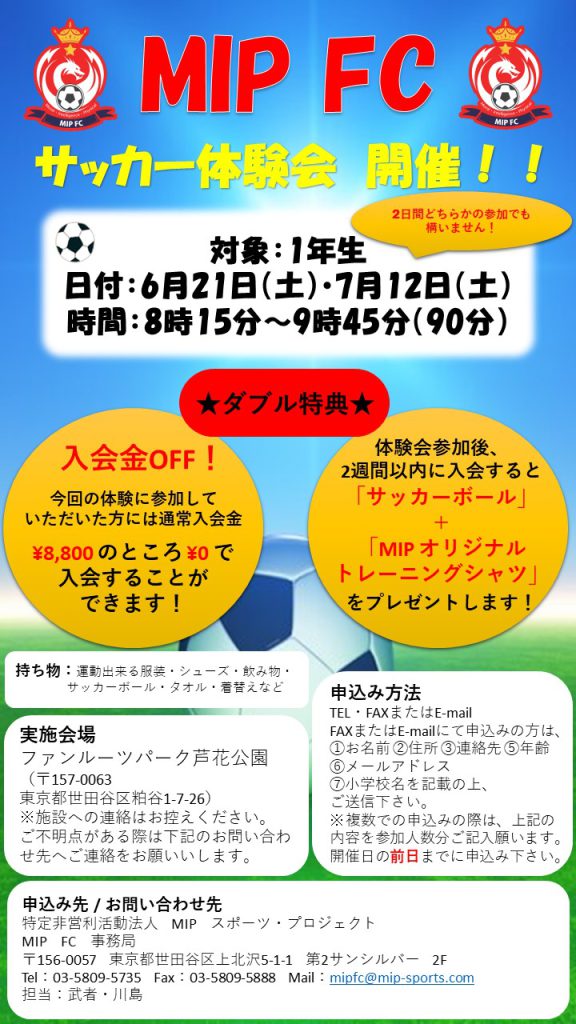 体験会参加後2週間以内に入会されますと、入会金OFF & サッカーボール・MIP オリジナルトレーニングシャツのダブル特典が付いてきます!